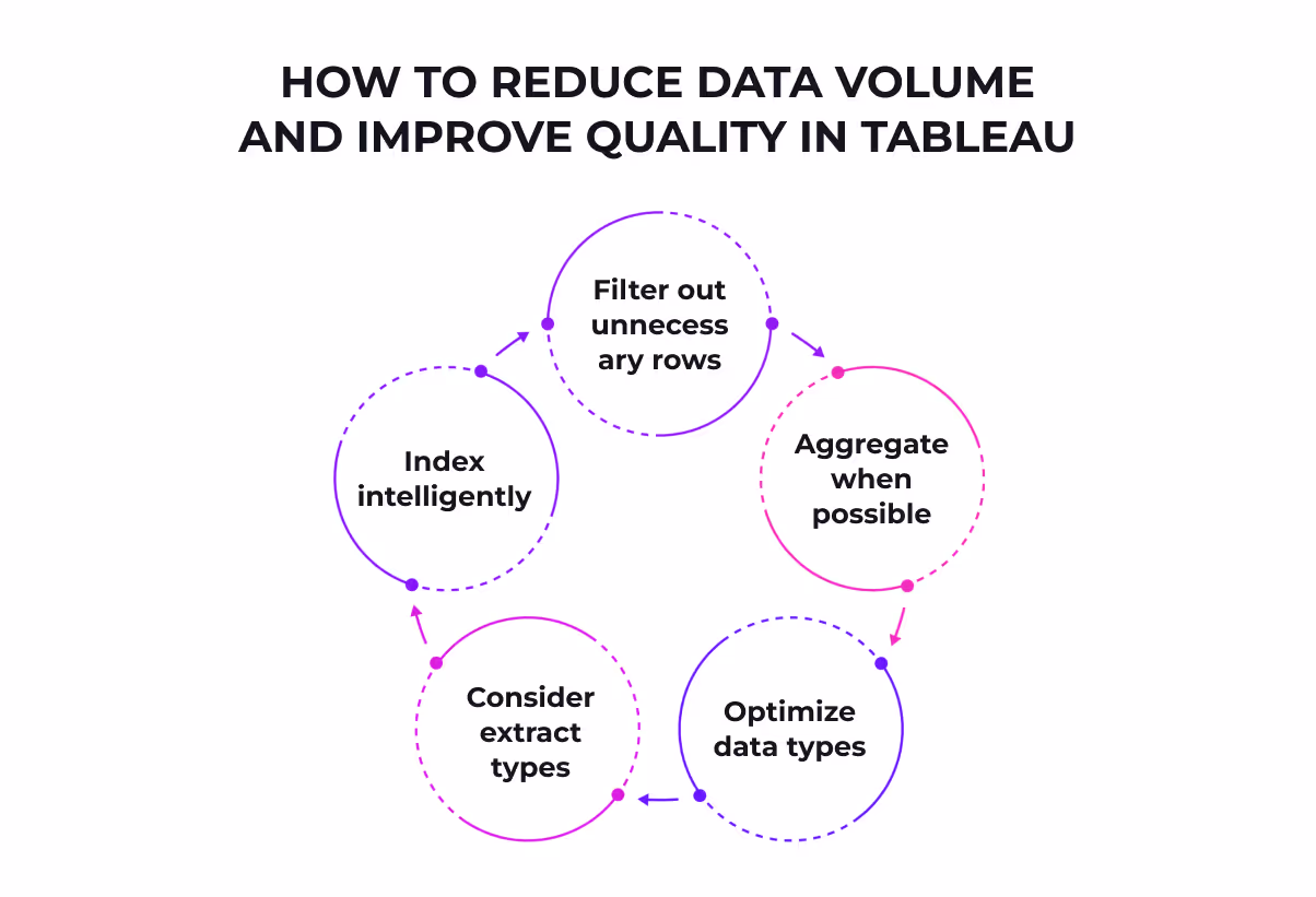Q3. How can I enhance the performance of Tableau extracts? To improve extract performance, keep your dataset concise by filtering or aggregating data, and narrow it down by hiding unused fields. You can use the "Hide All Unused Fields" and "Aggregate data for visible dimensions" options in Tableau Desktop to make these changes.