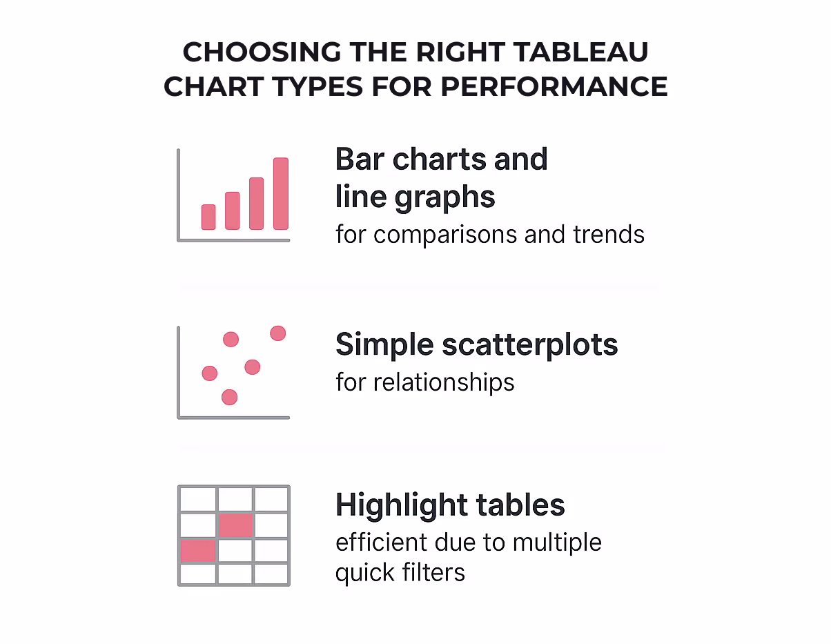 Chart selection impacts both visual clarity and processing speed. Consider these performance-friendly options:
