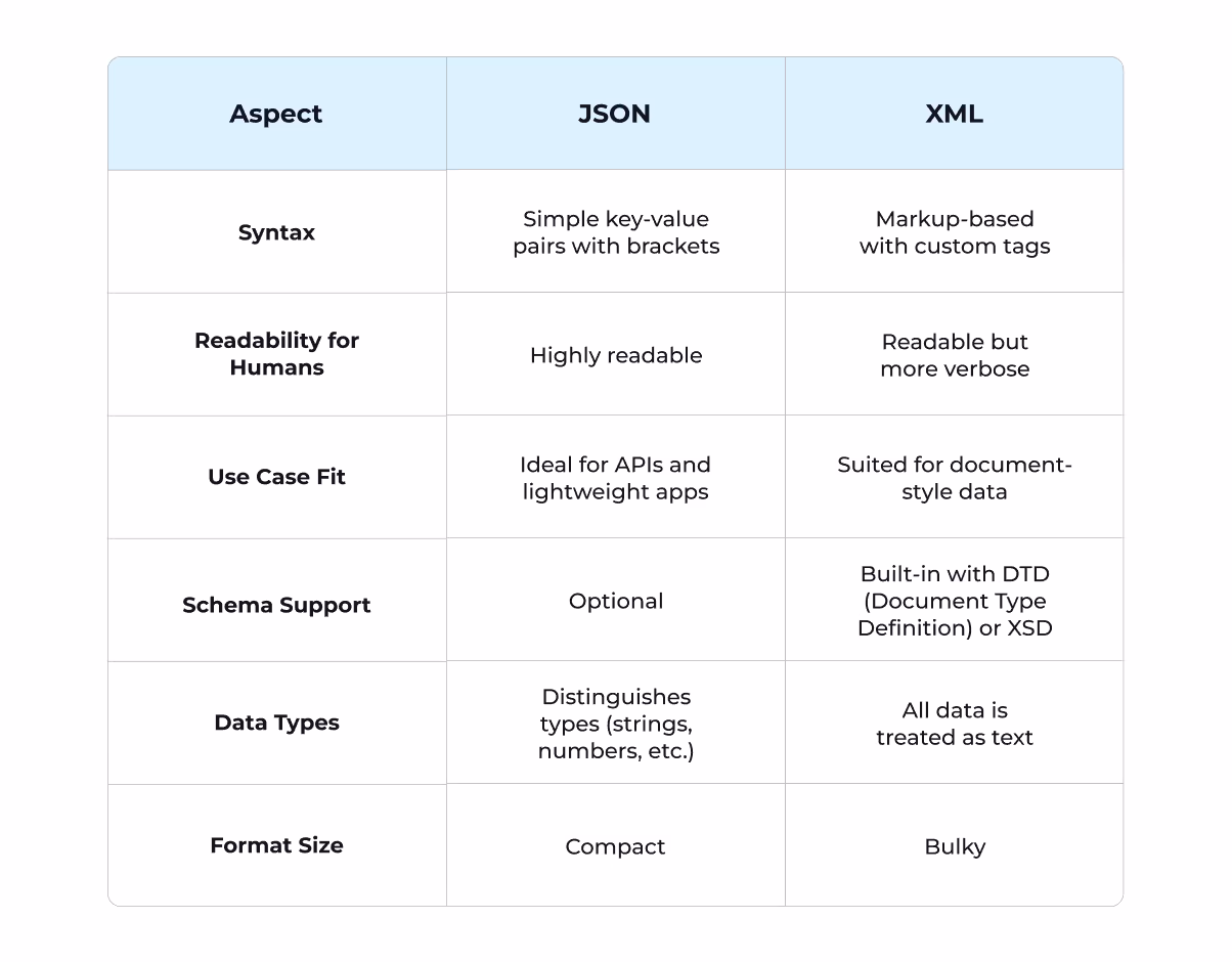 This guide breaks down everything you need to know about JSON and XML. By the end, you'll have a clear understanding of their strengths, limitations, and the best use cases for each—helping you make the right decision for your specific project.